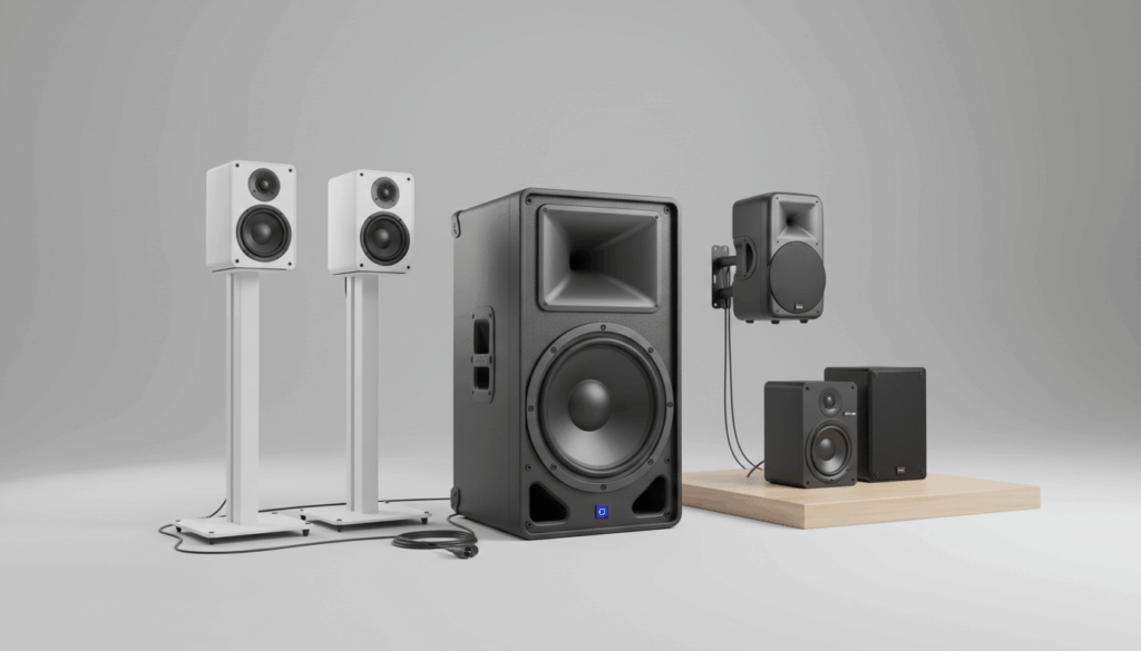 Variationer spænder fra små bordhøjttalere til store stage- og udendørsløsninger. Tænk på vægt, holdbarhed og transport samt vejrbestandighed og 100V-installation, hvis relevant.