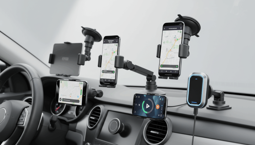 Ved køb: tænk på telefonstørrelse og etui, typisk 4–6 tommer. Vælg monteringssted (forrude, dash, eller vent). Tjek greb og anti-slip materiale, samt om der er trådløs opladning og kabelstyring. En stabil konstruktion og let betjening gør kørslen tryggere.