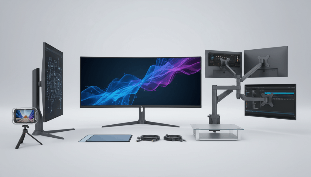 Dette område rummer kontorskærme, designskærme og mindre bærbare skærme samt tilbehør som filtre og monteringsudstyr. For at finde det rette, vælg ud fra opgave og plads, og vær opmærksom på farvegengivelse og kalibrering. Du kan finde løsninger hos MAXiPRO og Proshop.dk.