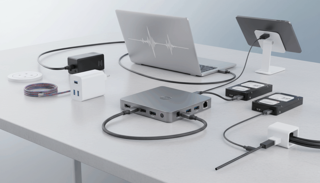 Når du vælger, vurder antallet og typen af porte (HDMI/DisplayPort/VGA), PD-ydelse og hvor meget strøm du har brug for, samt størrelse og byggemateriale. Tænk også på medfølgende kabler og garanti for langsigtet holdbarhed. Proshop.dk og Geekd kan hjælpe dig med at vælge den rette løsning.