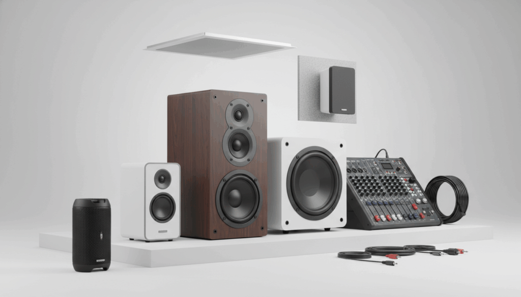 Variationerne spænder fra 2-vejs og 3-vejs konfigurationer til aktive enheder med indbygget forstærker og passive højttalere, samt mindre bordhøjttalere, store gulvmodeller og diskrete indbygningsløsninger. For udendørs og miljøer vælger du vejrbestandige modeller, mens 100 V-løsninger er ideelle til distribution i butikker og lokaler.