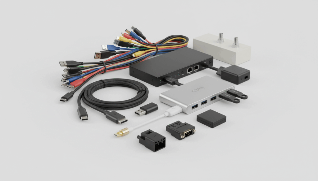 Når du vælger, overvej stik og standarder (USB 2.0/3.0/3.x, HDMI/DP), længde, kabelkvalitet og afskærmning, samt om det skal være passivt eller aktivt og om der er behov for strøm (PD). Overvej holdbarhed og rejseegenskaber, især hvis udstyr ofte flytter sig. Variationer: USB-C hubs og adapters til HDMI/VGA, netværksadaptere, rejseadaptere og KVM-sæt til kontor og serverrum. Det giver dig mulighed for at samle dit setup uden kabelrod og sikre pålidelig tilslutning i alle scenarier.