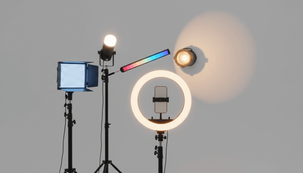 Ved køb bør du vurdere lysstyrke (lumen), farvetemperatur og farvegengivelse (CRI/TLCI), dæmpning og om lyset er AC-drevet eller batteridrevet, størrelse og vægt, varmeudvikling samt hvem der kontrollerer lyset (DMX, fjernbetjening eller app). Overvej også typen inden for kategorien: ringlys, panellys, spots og strobe, samt tilgængelighed af tilbehør som stativer og transportkasser.