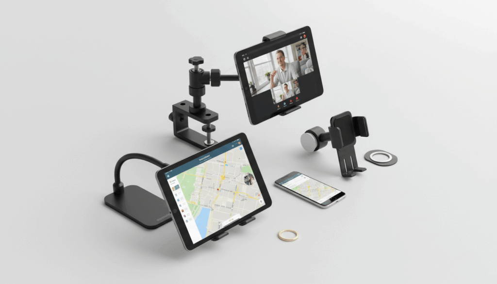 Anvendelserne spænder fra navigation og videokonferencer til optagelser og streaming. Variationerne dækker alt fra kompakte popsockets til fleksible skrivebordsstandere og MagSafe-stændere.