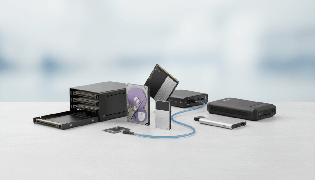 Når du vælger, bør du overveje grænseflade og formfaktor (SATA, SAS, USB, NVMe), kapacitet og hastighed (SSD/NVMe vs HDD), samt om løsningen er intern, ekstern eller NAS-udvidelse. Robuste og hot-swap muligheder passer til servere og datacentre, mens enkle eksterne drev og bærbare SSD'er er perfekte til mobil lagring. Husk også kompatibilitet med dit system og eventuelle behov for RAID eller sikkerhedskopieringsløsninger.