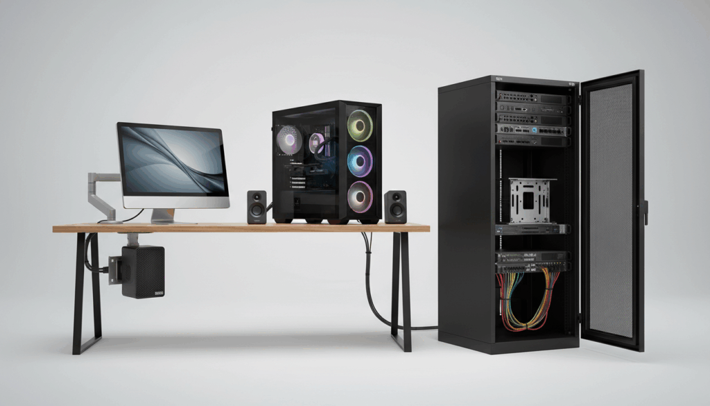 Stationære produkter dækker desktops, mini-PC’er, workstation-løsninger og kabinetter, der er beregnet til fast placering på arbejdspladsen. I denne kategori finder du alt fra tårn- og all-in-one-desktopcomputere til kompakte mini-PC’er og specialdesignede kabinetter, der passer til forskellige rum og behov. Nøglefunktioner inkluderer kraftfulde processorer, stor hukommelse, hurtige lagringsløsninger og køleløsninger, samt rige tilslutningsmuligheder (USB-C, DisplayPort, HDMI og netværk). Overvej formfaktor, udvidelsesmuligheder, støjniveau og energiforbrug samt kompatibilitet med skrivebordsmontage og VESA-arm. Tilbehør som CPU-holdere, bord-/vægmontering og KVM-switches øger fleksibiliteten, og rack-skabe giver professionel organisering. Proshop.dk og Phonetrade hjælper dig med at finde den rette stationære løsning til arbejde, kreative opgaver og hjemmebrug.
