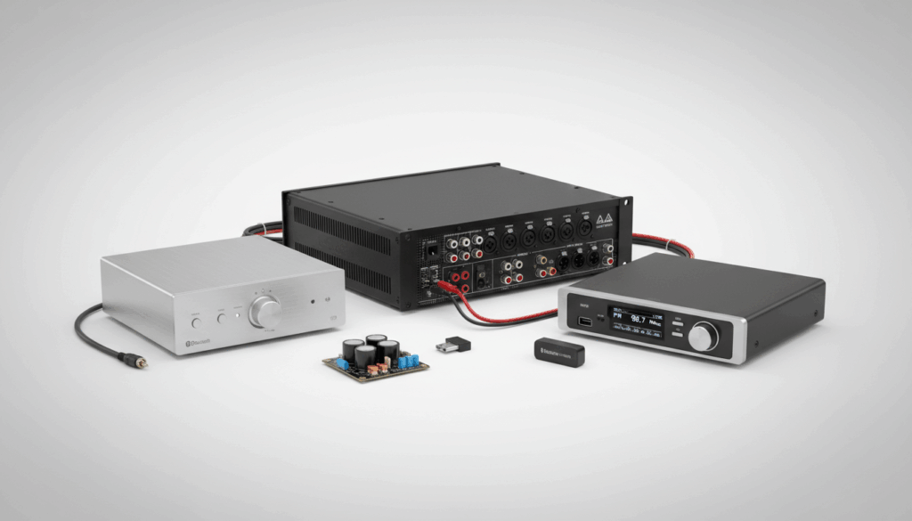 Vigtige købsparametre er effekt (W RMS), impedans og antal kanaler, samt tilslutninger (XLR, RCA, klemterminaler) og mulighed for brokobling. Overvej også, om en 100 V-løsning er nødvendig, og om du vil have beskyttelse som limiter eller termisk beskyttelse. Mange modeller fås som bordmodeller, 19''-rack eller små Bluetooth-enheder – vælg ud fra installationsbehov og plads.