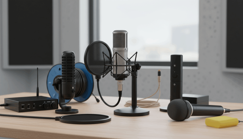 Variationerne gør valget personligt: store-diaphragm kondensatorer til stemme, dynamiske til robust levering og bord- eller overhead-mikrofoner til instrumenter samt lavalier til interviews. Tilbehør som popfiltre og svanehalse gør opsætningen lettere.